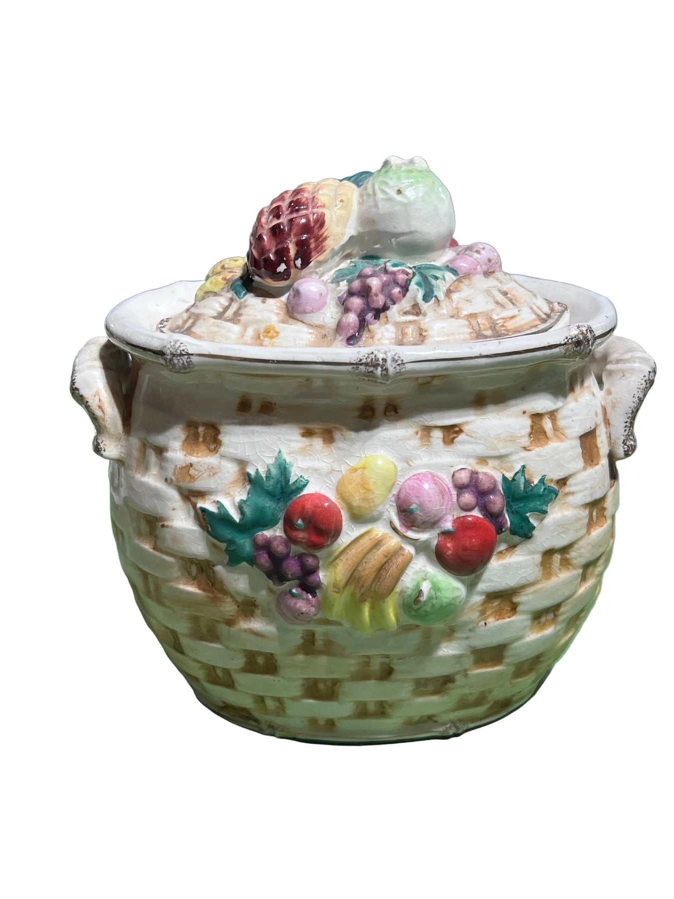 Vintage Fruit & Basket Weave Set with Small Jar, Covered Box & 2 Tidbit Plates