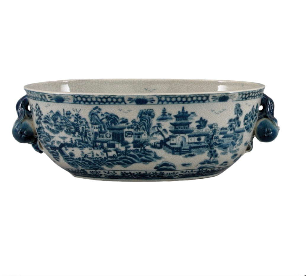 Beautiful Large Oval Chinoiserie Footbath with 3-D Handles featuring blue and white porcelain landscape design, gallery position 1