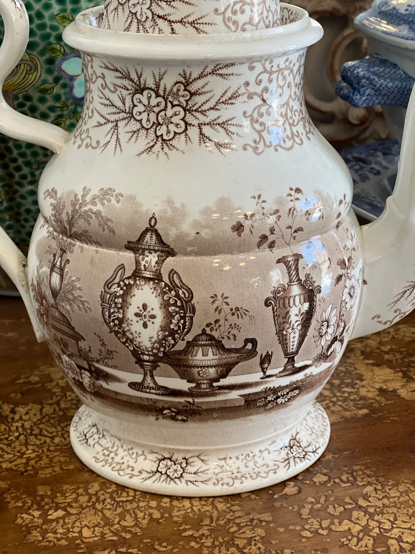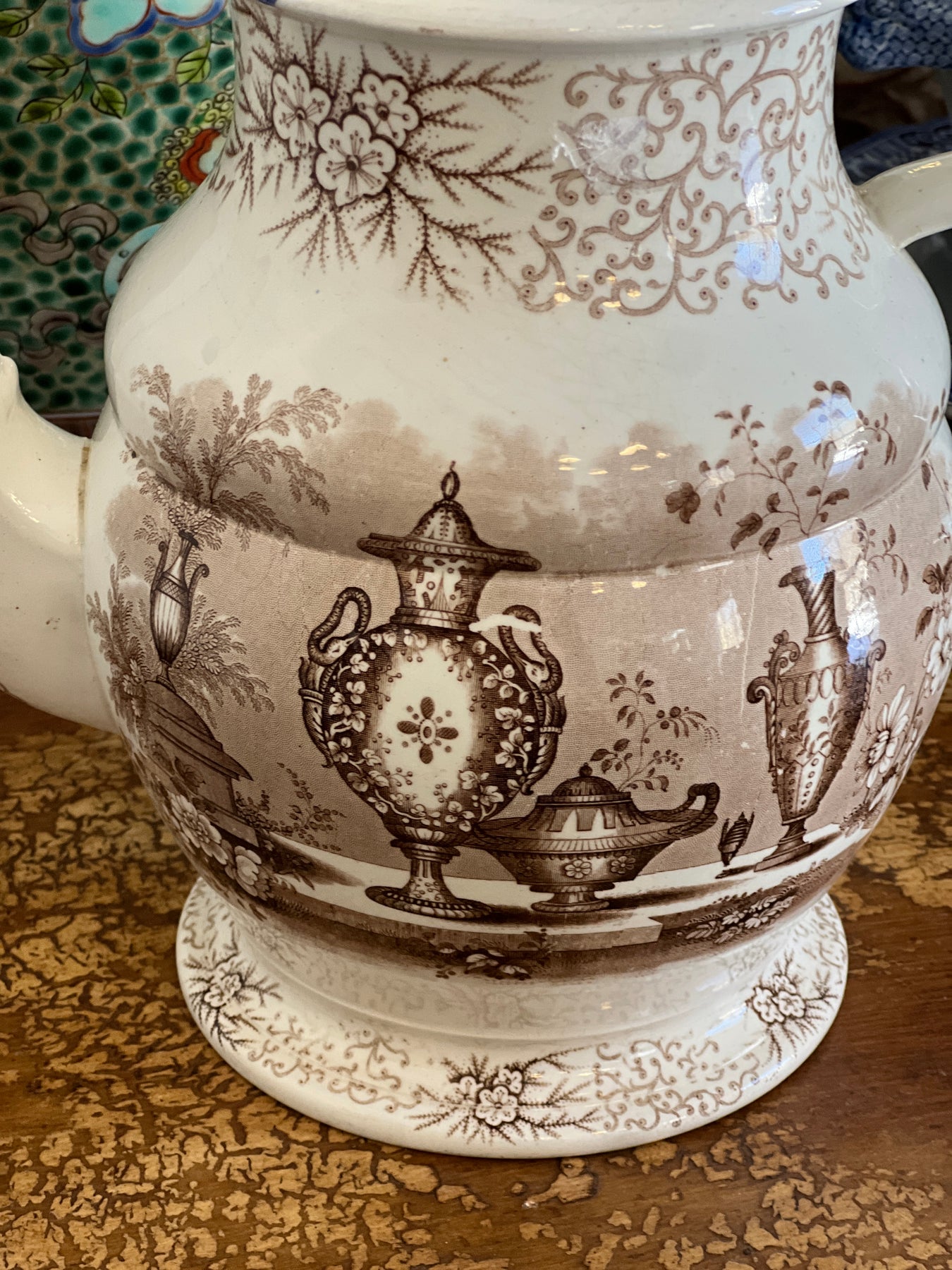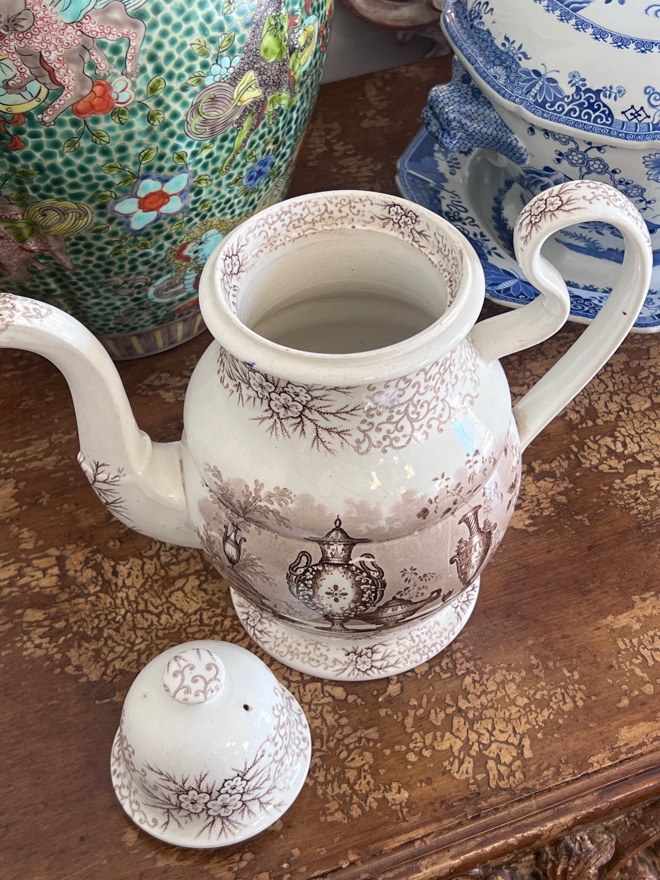 Gorgeous Huge Antique C. 1800s Brown & White "Antique Vases" Transferware Teapot