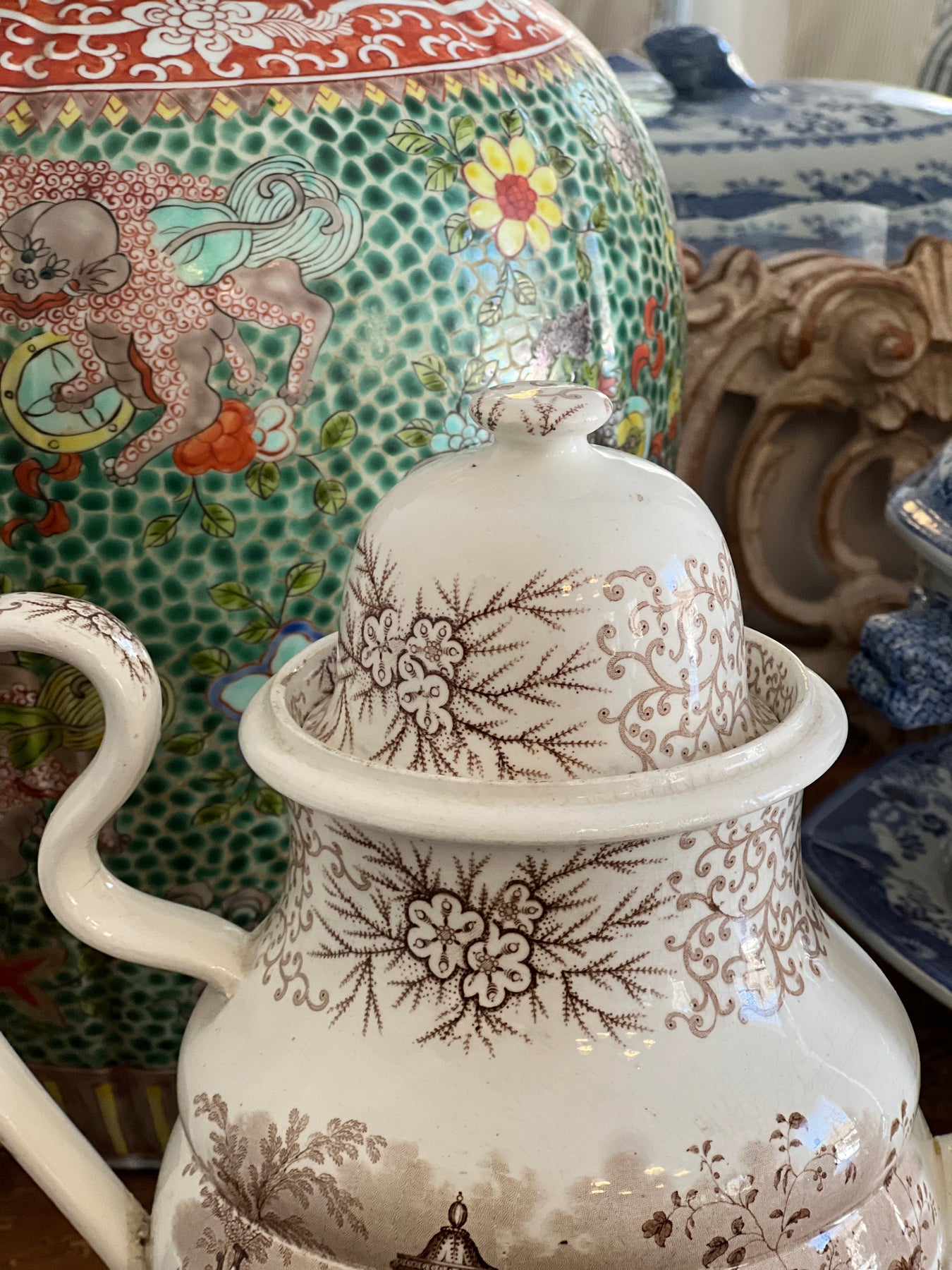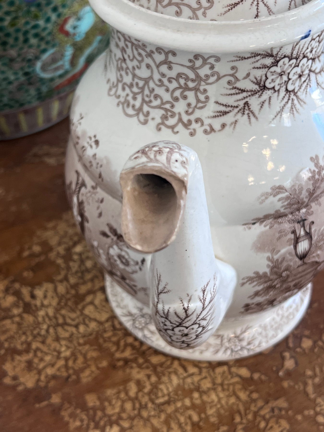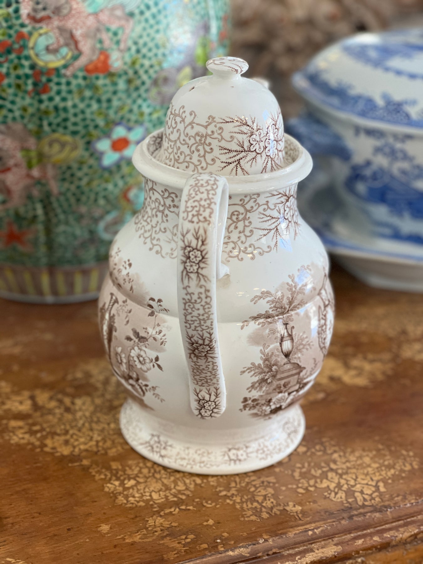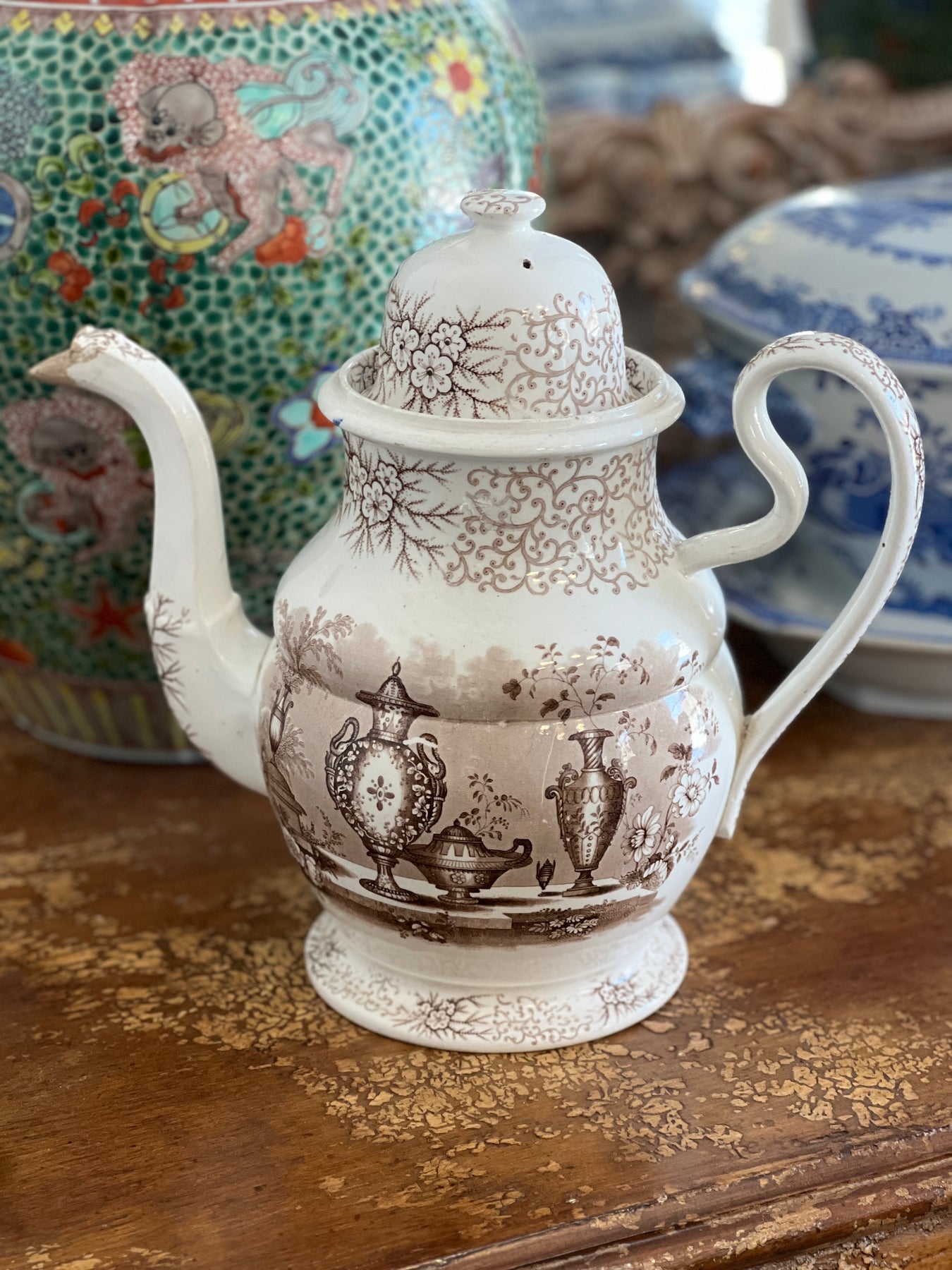 Gorgeous Huge Antique C. 1800s Brown & White "Antique Vases" Transferware Teapot