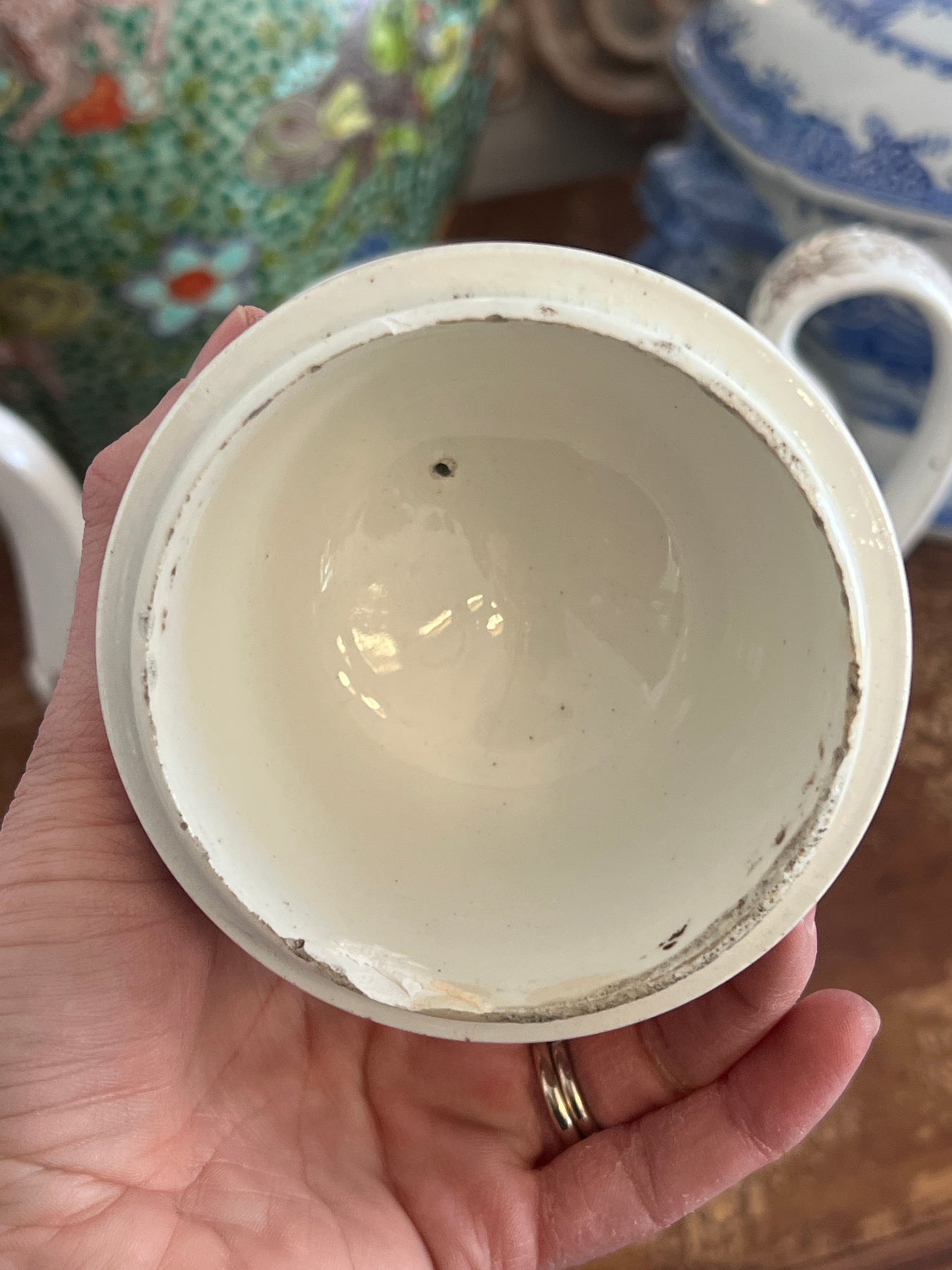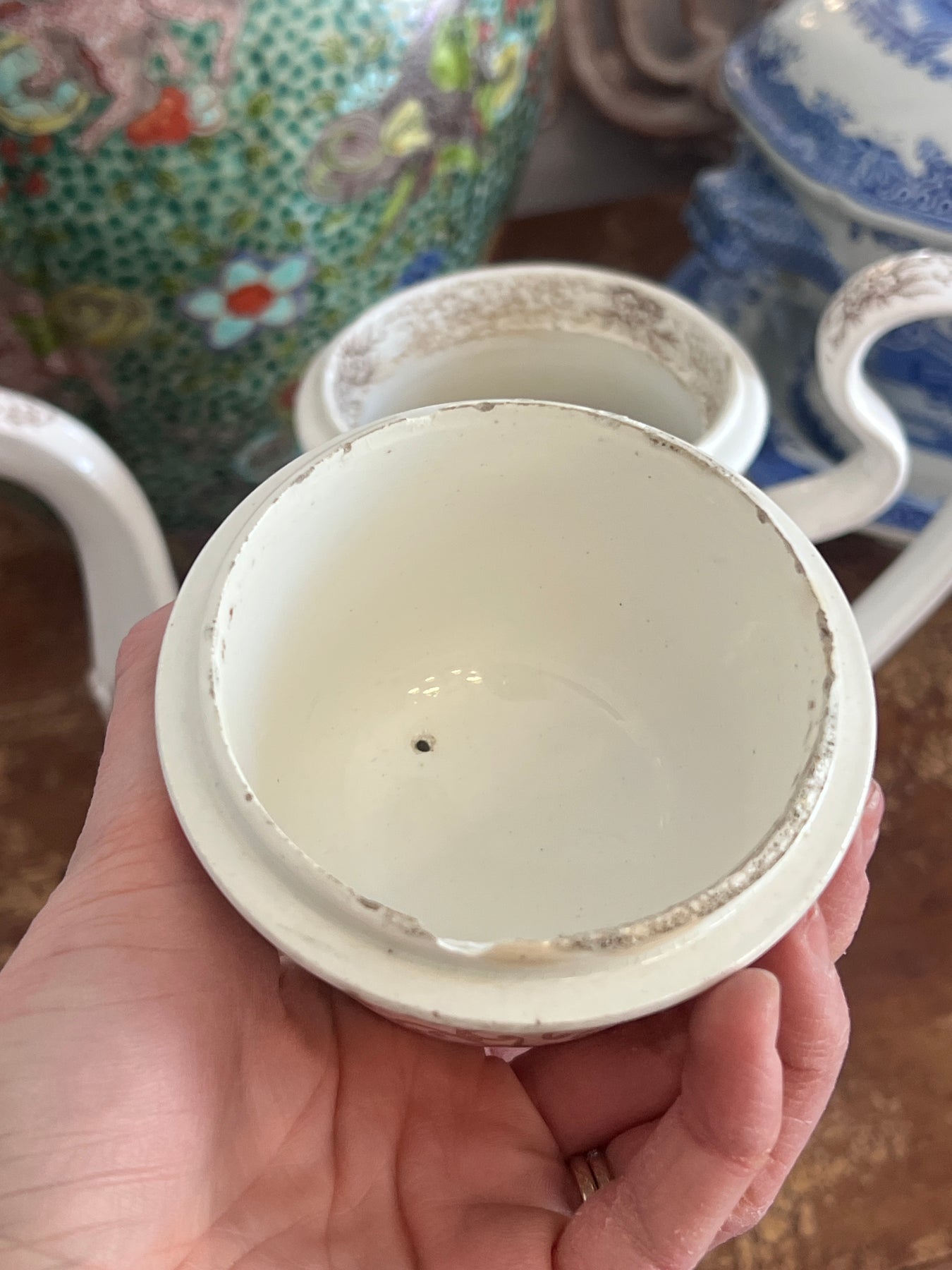 • Condition Notes: In antique condition with wear commensurate with its very old age, including grit in the glaze, crazing, chips on the inner rim of the lid; wear to the spout. Tight, short hairline on the inside of the handle. Overall very good condition for a piece that would have been used often!