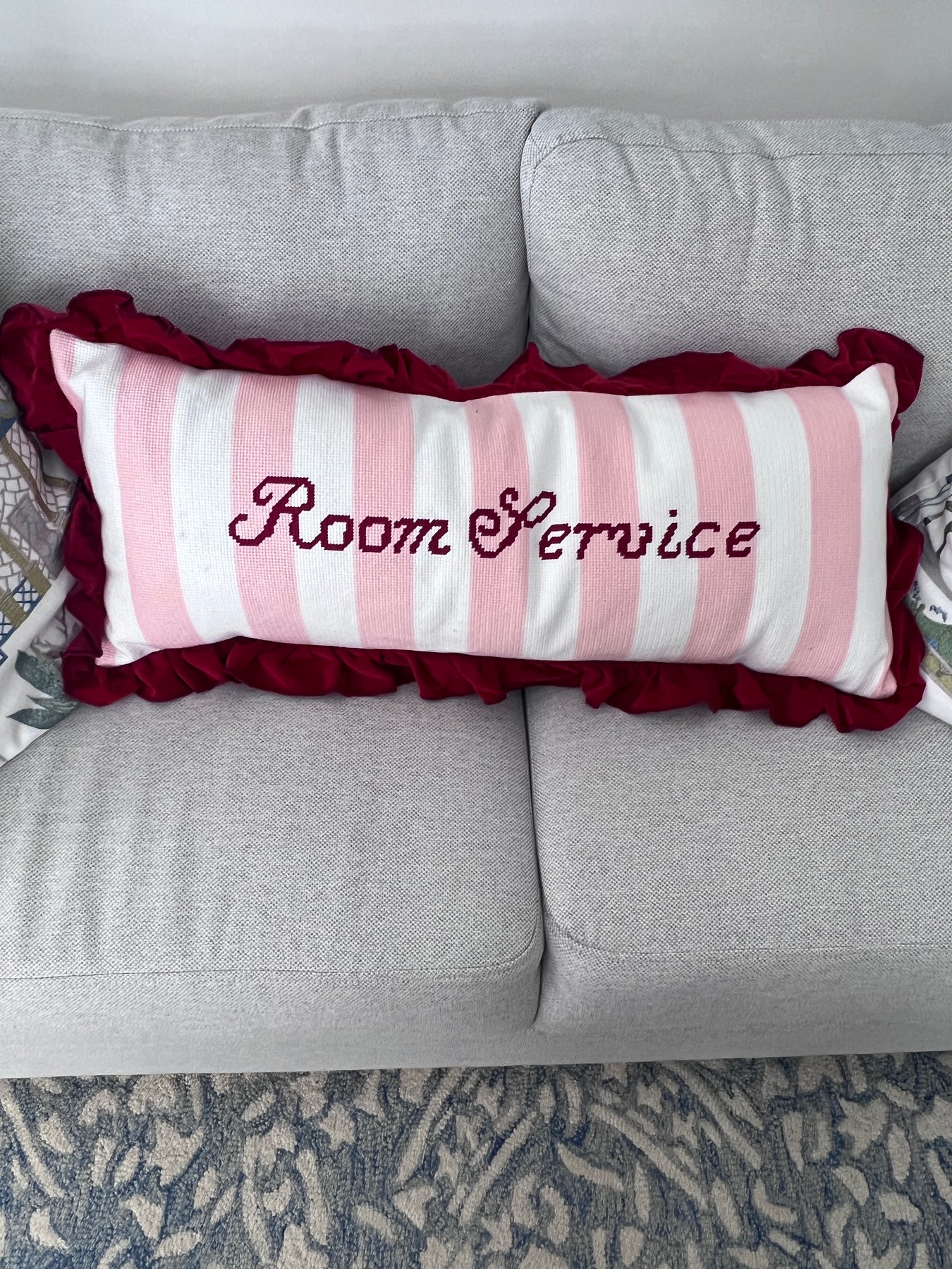- XL “Room Service” Needlepoint Pillow with ruffle trim